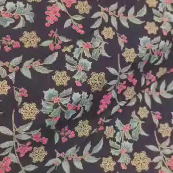 Motif: Sprigs of holly with deep red berries and delicate golden snowflakes set against a rich black background.