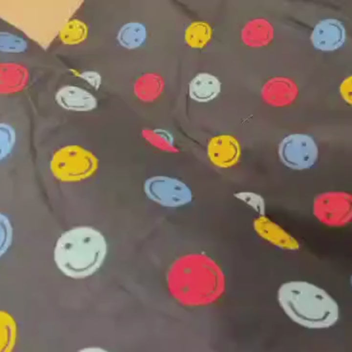 Multi colored Be Happy Face FLANNEL fabric on navy blue