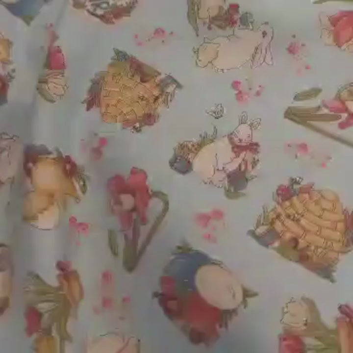 Motif: Tossed spring themes of rabbits, chicks, flowers and more on light blue.
