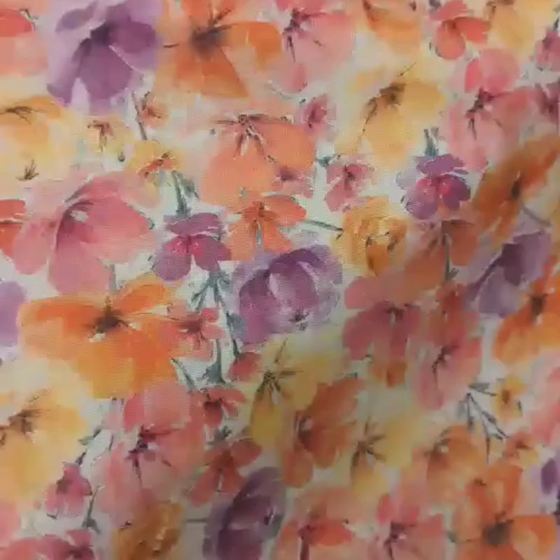 Add a splash of color to your home with Watercolor Florals, Mon Jardin, Chandelier! This stunning cotton print features warm orange, yellow, and purple pastel hues, bringing a touch of nature indoors. Perfect for quilts, home decor, and more.
