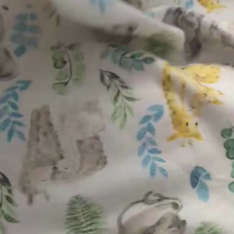 A nursery flannel with mother and baby animals print in pastel. Transform your nursery into a playful and charming space with this ultra-soft flannel! Let the soothing and adorable mother and baby animals print in delicate pastels delight your little one as they drift off to dreamland.
