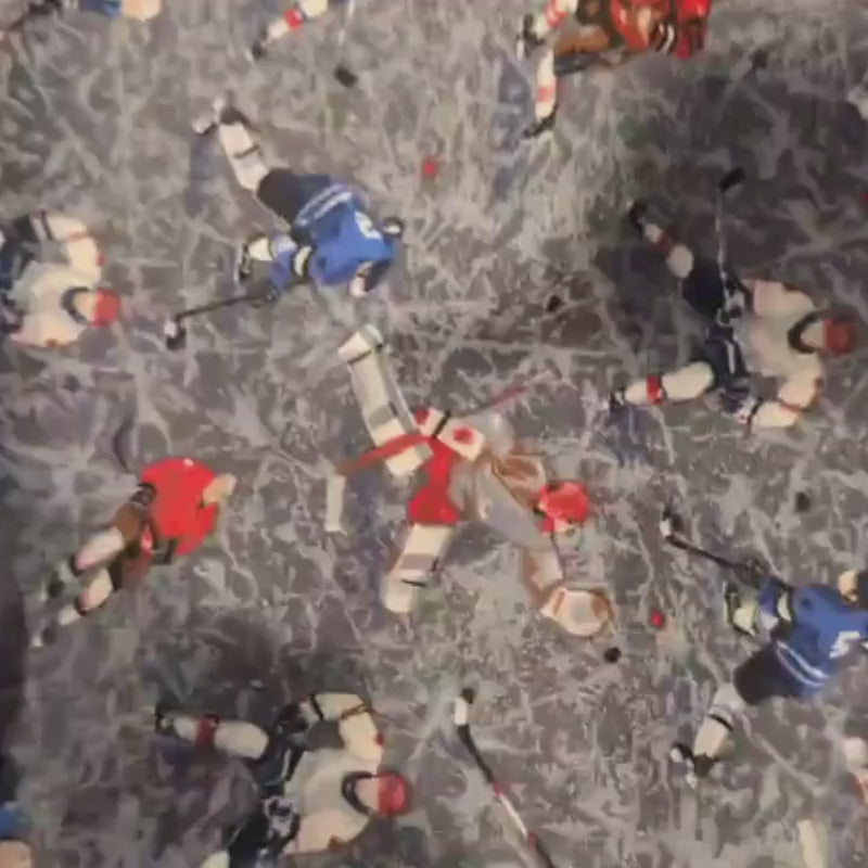 This flannel boasts a cool cracked ice design with hockey players. Perfect for staying warm during hockey games (or just looking cool).