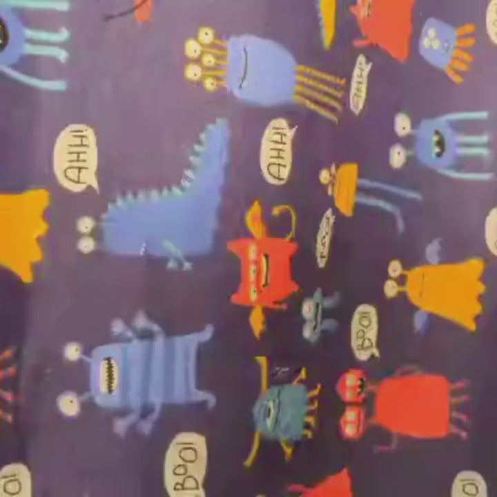 Let 'em know you mean "boo" with this fun, navy flannel fabric featuring colorful monsters shouting "Boo!" Perfect for a spooky costume, or just some added oomph to a cozy blanket!