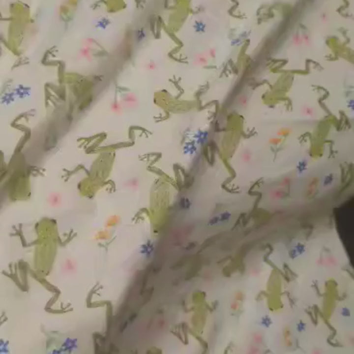 Soft and cozy flannel fabric featuring cute green frogs accompanied by vibrant pastel florals, all set against a crisp white background. Perfect for snuggling up and hopping into bed!